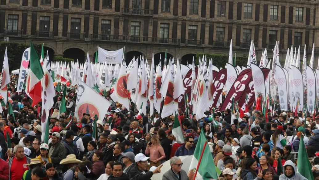 Cientos de ciudadanos que apoyan el Movimiento de Regeneración Nacional (Morena) continúan dirigiéndose a inmediaciones de la Plaza de la Constitución para escuchar el mensaje que dará la presidenta Claudia Sheinbaum en conmemoración a los 7 años de la 4T en el gobierno.
